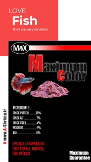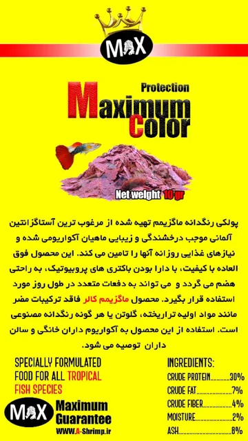 maximum color A Shrimp غذای ماکسیمم کالر تشکیل شده از رنگ دانه های طبیعی بدن ماهیان است که برای تقویت رنگ انواع ماهی ها بسیار مفید می باشد