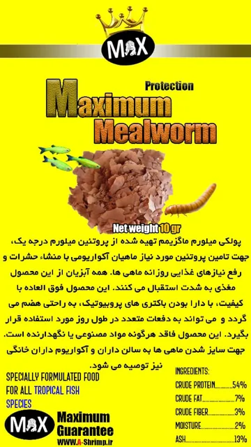 maximum mealworm A Shrimp غذای ماکزیمم میلورم ای شریمپ یک غذای پروتئینی است که بر پایه کرم میلورم مخصوص ماهی های آکواریومی است